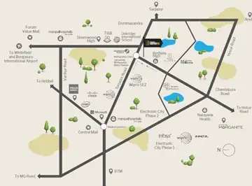 Sarjapur Road in Bangalore positions you in the middle of bthe est social and physical infrastructure. Your township is closer to Oakridge International School, Global Indian International School, Spanadana Heart and Super Specialty Hospital, Sri Lakshmi Multispeciality Hospital, Virginia Mall, Dmart, Bosch EC3, Embassy Tech Village,Azim Premji University, Nexus Whitefield, etc. The Carmelaram Railway Station, Sarjapur Marathahalli Road, the Bangalore Mumbai Highway, etc ensure easy commute across the city and beyond. The upcoming Muthanallur Cross Metro Station is located just 700 metres away, enhancing commute and reducing traffic by road. So, live royally in the exquisite township of Nambiar District 25 off Sarjapur Road, Bangalore. Read more
